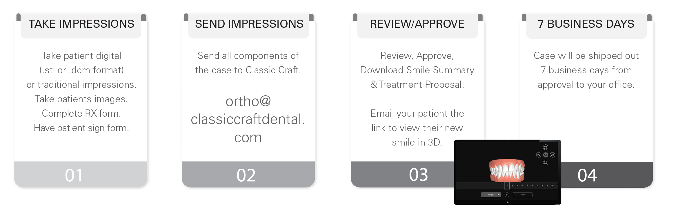 If you have questions call or email Dylan West at 877.552.7238 or ortho@classiccraftdental.com for assistance.